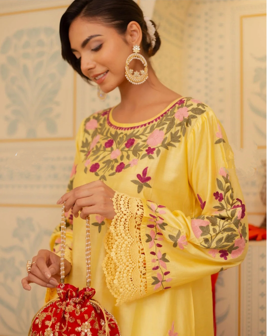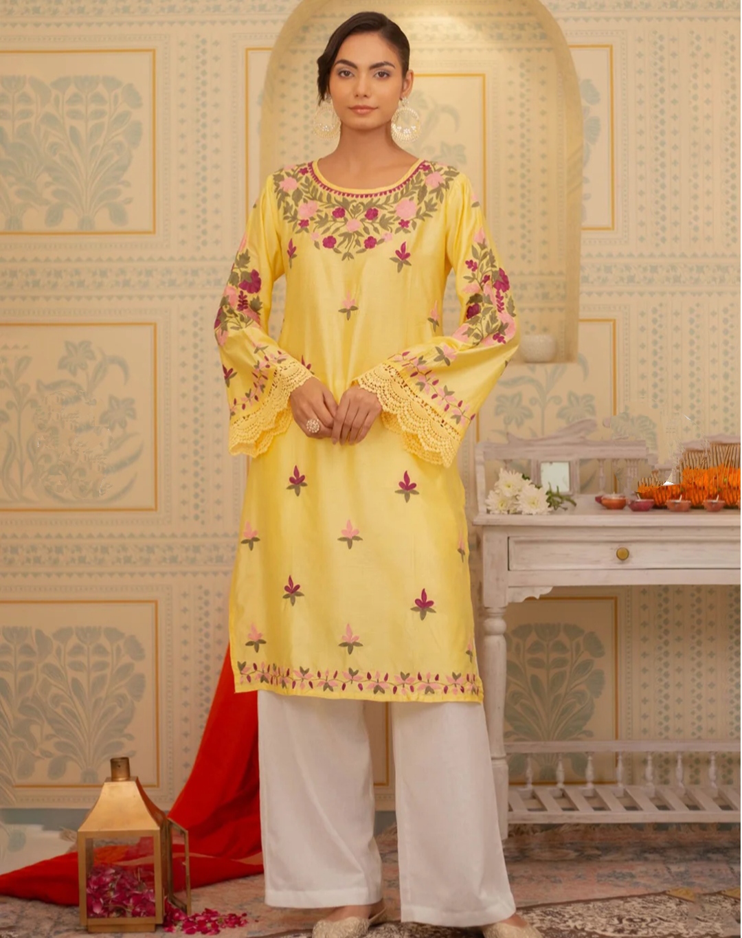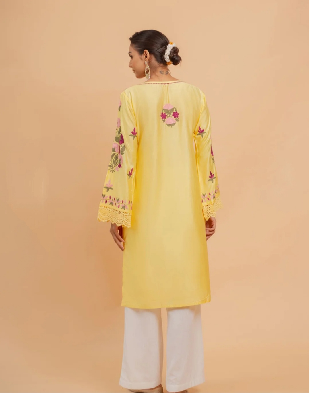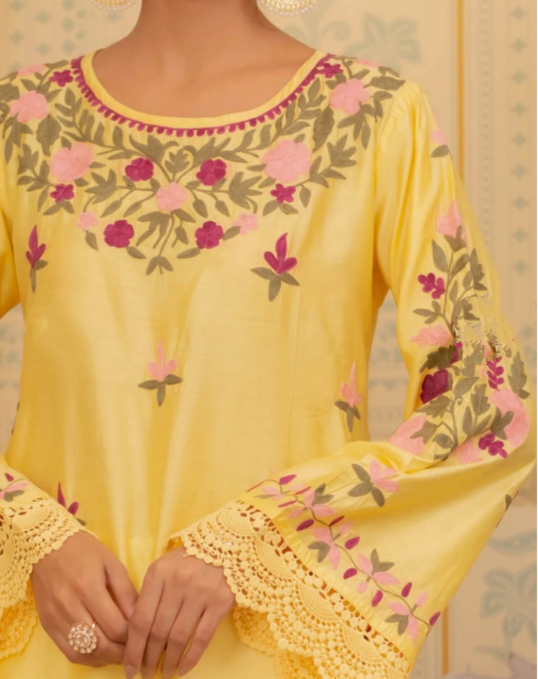 Radiate pure luxury in our bright yellow Kashmiri Ari embroidered outfit, a striking expression of timeless elegance and artisanal mastery. Adorned with heavy, multi-color floral embroidery, this exquisite piece celebrates the richness of traditional Kashmiri Ari work, brought to life on a luminous yellow canvas that exudes warmth, vibrance, and sophistication.