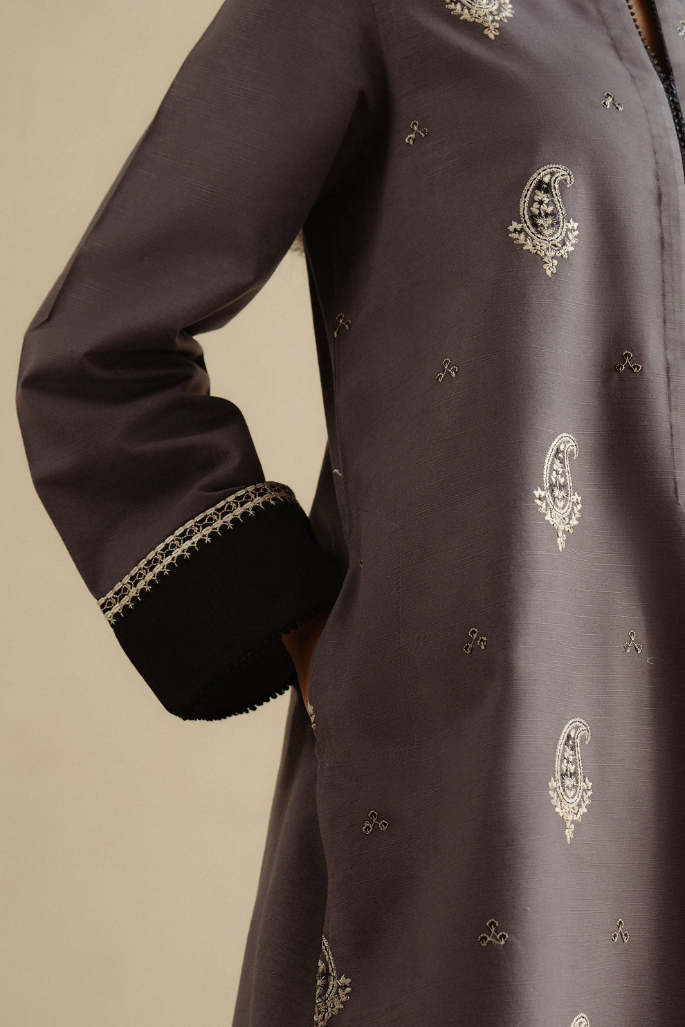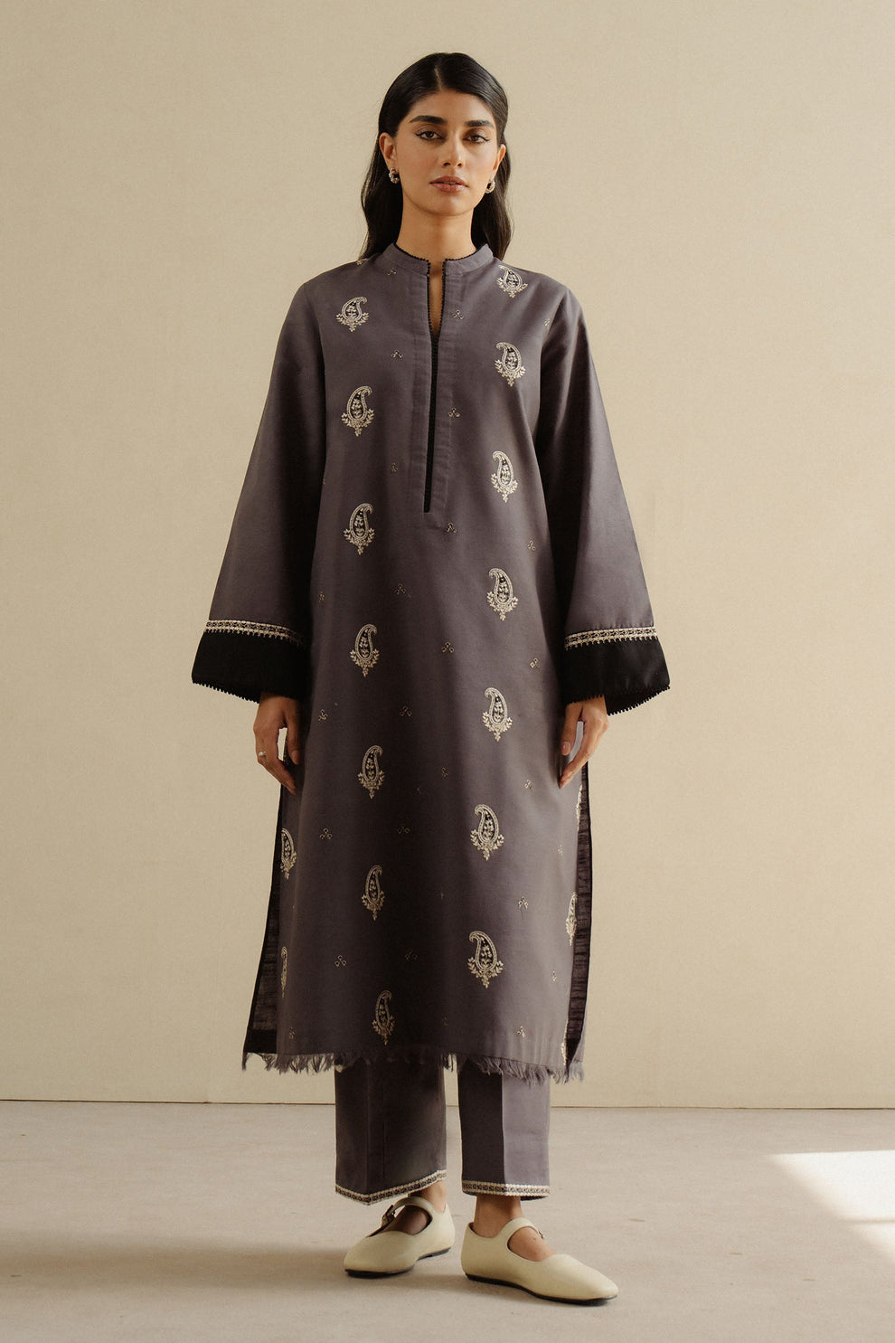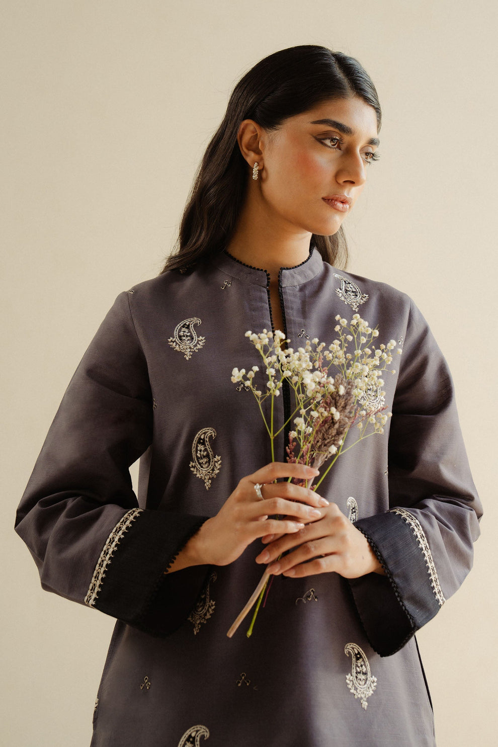 Midnight Bloom — a vision of elegance inspired by soft hues and timeless sophistication. Crafted from premium Karandi, Khaadar, and Marina fabrics, this outfit offers a graceful drape, luxurious comfort, and refined finishing—perfect for both daywear and evening charm.